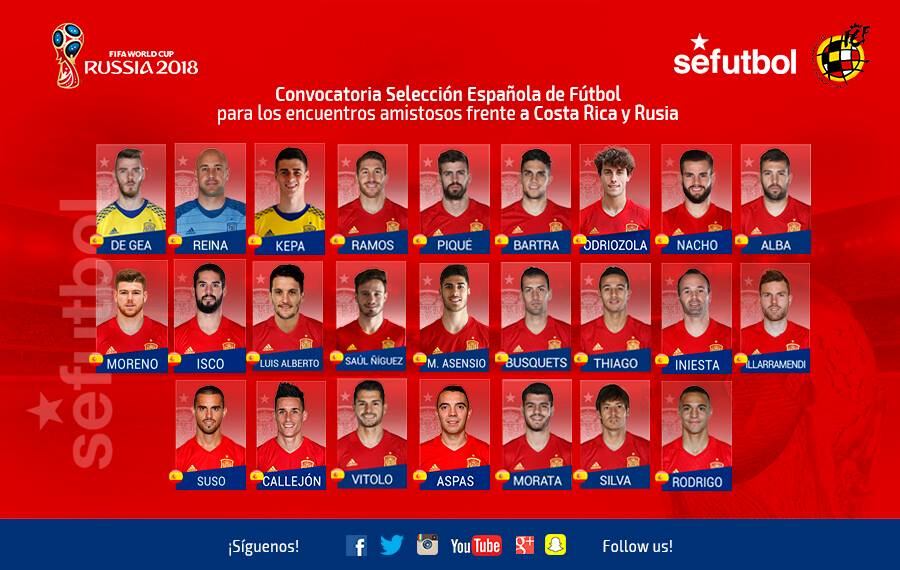 España, conservando su columna vertebral, optó por ofrecer un poco de sangre nueva a su selección para los amistosos ante Costa Rica y Rusia a mediados de noviembre, que servirán de preparación para el Mundial de Rusia 2018.