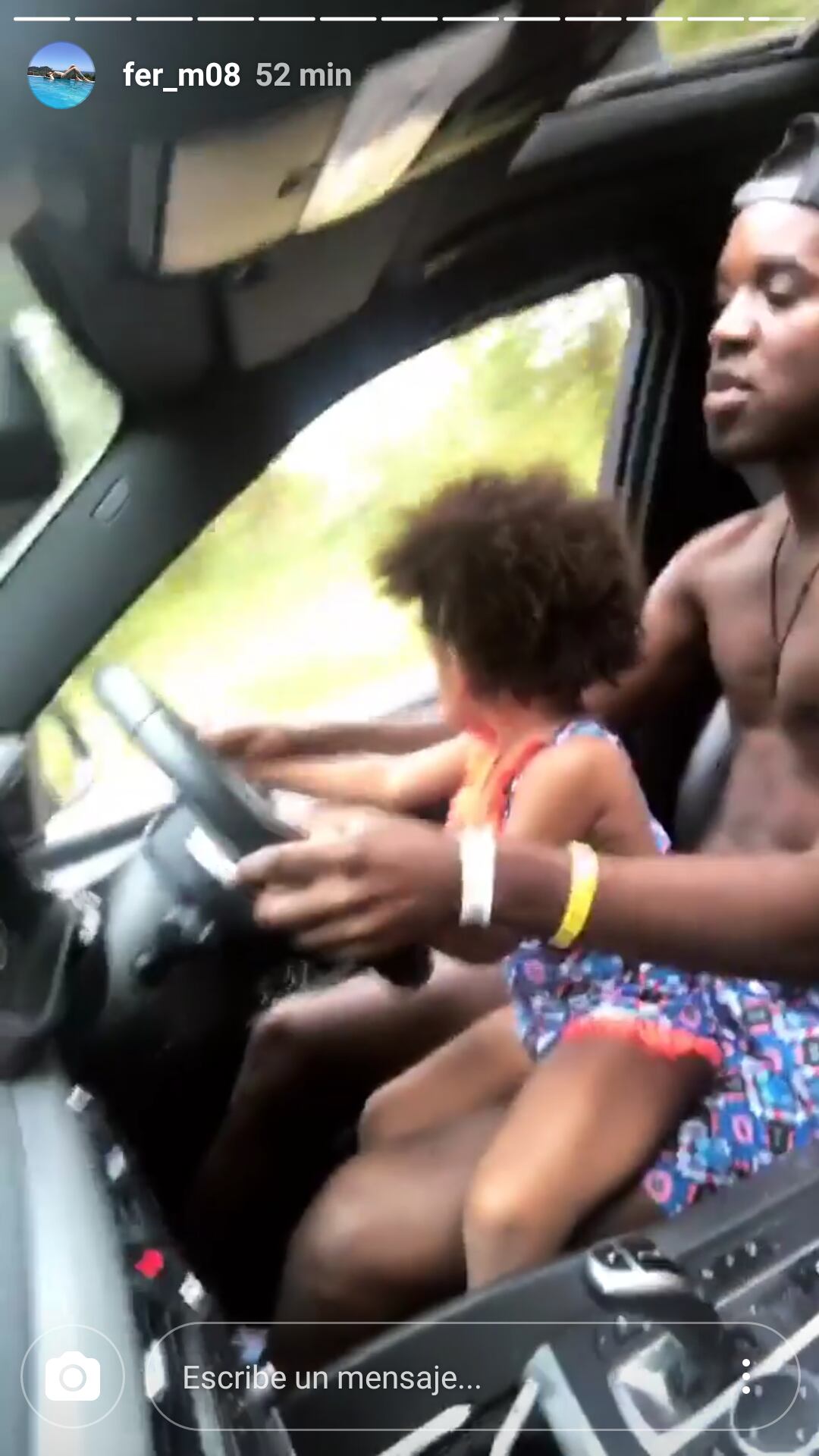 El futbolista no parece llevar puesto el cinturón de seguridad y además pone en riesgo la vida de la pequeña al llevarla en el asiento delantero.