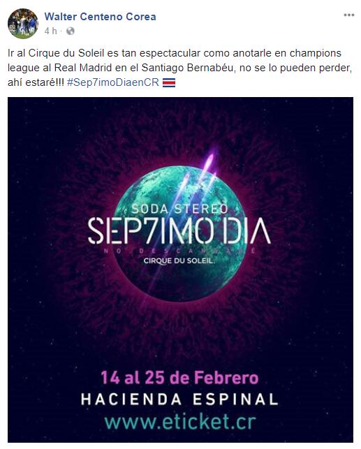 "Ir al Cirque du Soleil es tan espectacular como anotarle en champions league al Real Madrid en el Santiago Bernabéu, no se lo pueden perder, ahí estaré!!! #Sep7imoDiaenCR", escribió en Facebook el exfutbolista.