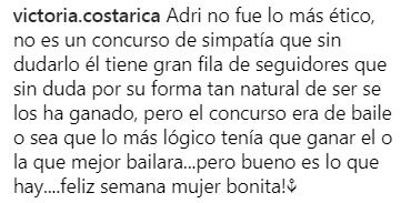 "Adri no fue lo más ético, no es un concurso de simpatía que sin dudarlo él tiene gran fila de seguidores que sin duda por su forma tan natural de ser se los ha ganado, pero el concurso era de baile o sea que lo más lógico tenía que ganar el o la que mejor bailara...pero bueno es lo que hay....feliz semana mujer bonita", escribió la usuaria.