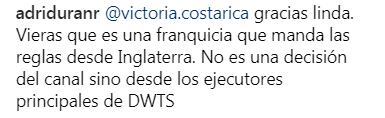 "Vieras que es una franquicia que manda las reglas desde Inglaterra. No es una decisión del canal sino desde los ejecutores principales de DWTS", señaló Durán.