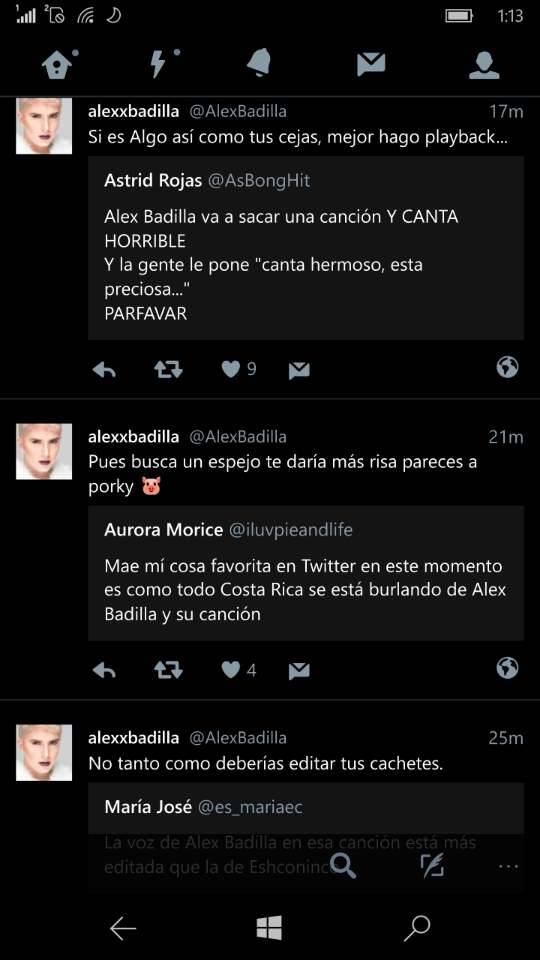 El vídeo provocó tal cantidad de críticas que lo hicieron explotar y propiciar una guerra de insultos desde su cuenta de Twitter @alexbadilla contra quienes se burlaron de su forma de cantar y bailar.