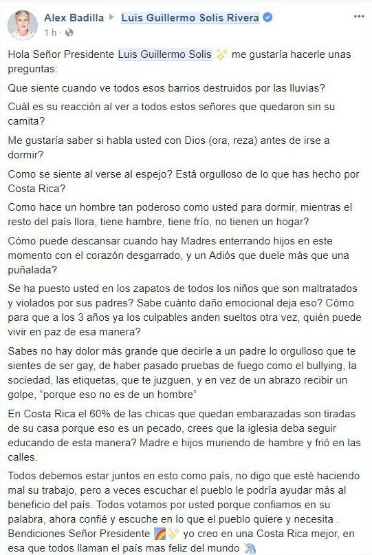 El post, Badilla se lo tiró en la cuenta de Facebook del mandatario y terminó explotando en redes sociales, con severas críticas a lo que decía en momentos en que varias personas han muerto por las lluvias y los deslizamientos.