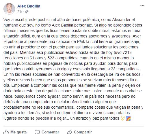 Por su parte, Alex hizo una aclaración en sus redes donde tachó a los ticos de "doble moral", pues aseguró que las personas le dieron más importancia a su post que a los mensajes de donaciones y apoyo a los damnificados.