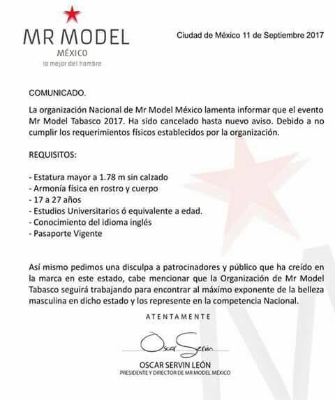 A los concursantes del Mr Model Tabasco 2017 los dejaron vestidos y alborotados, ya que la organización decidió cancelar el concurso por considerar que los aspirantes no cumplían “los requerimientos físicos establecidos”.
