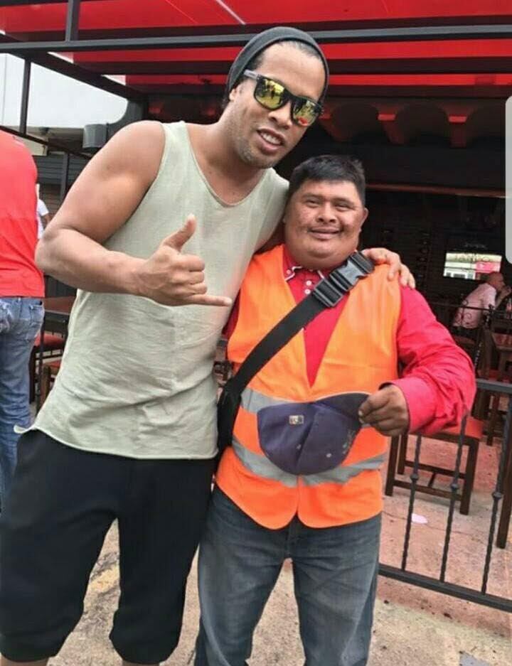 Pedro, el "guachi" del restaurante "Sabor a tango", a quien dimos a conocer en La Teja por colarse en las fotos que se tomaban los exparticipantes de "Tu cara me suena", pegó un fotón con el astro del fútbol brasileño Ronaldinho.