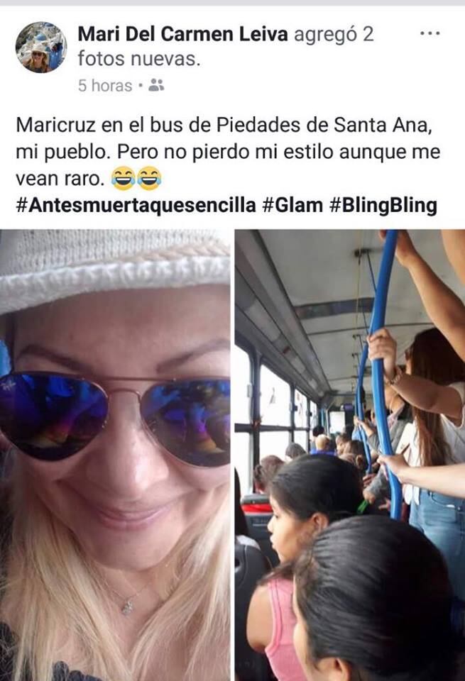 A la presentadora Maricruz Leiva tal vez se le olvidó lo que es ser humilde, porque el miércoles anterior subió varias fotografías en su perfil de Facebook para contar la gran experiencia que estaba viviendo al viajar en el bus de Piedades de Santa Ana, como si solo en carro hubiera andado toda la vida.