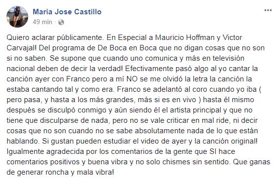 Pero, según explica la misma María José en su redes sociales, lo que pasó fue que Franco de Vita se adelantó en el coro.