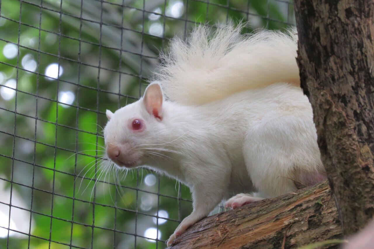 La ardillita se llama Rubí y tiene cuatro años, mide unos 25 centímetros y al igual que sus hermanitos albinos, llegó al Zooave rescatada por alguna persona que la fue a dejar ahí para que la cuidaran bien.