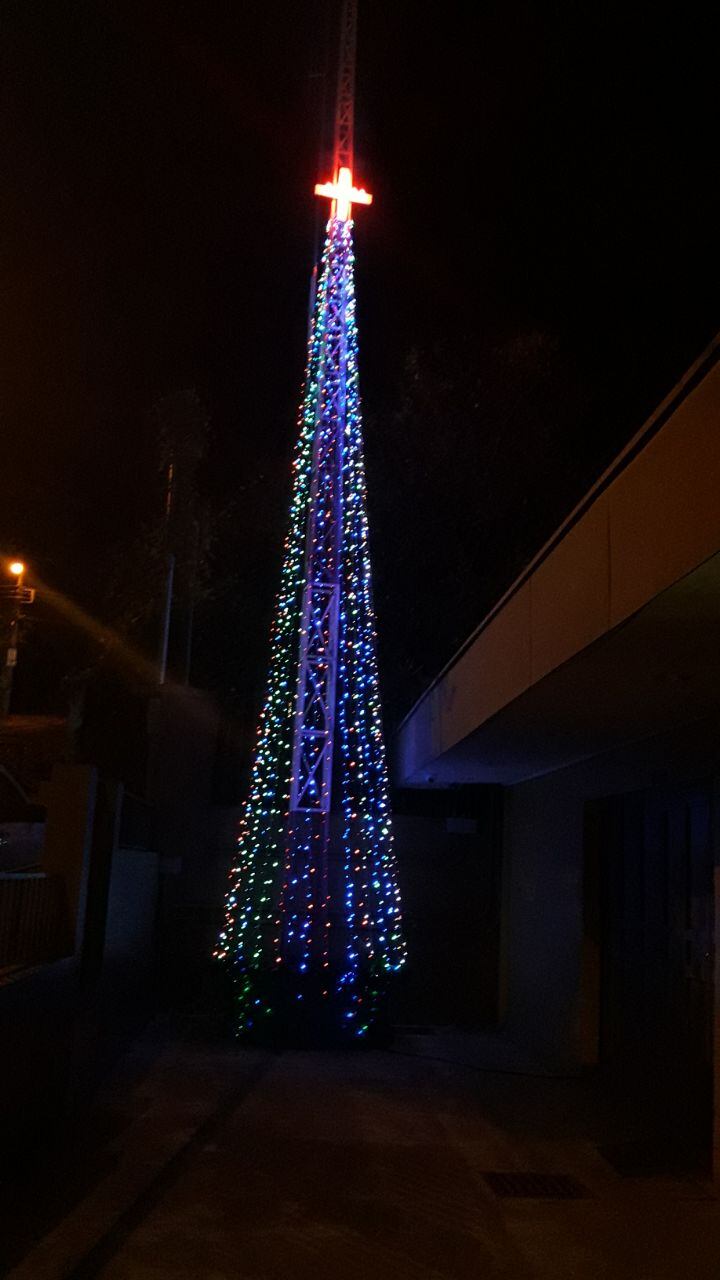 El árbol están tan lleno de luces que llama la atención desde muy lejos, gracias a su forma de pino. Además, en la pura cima le encaramaron una cruz roja, demostrando lo ingeniosos que son en ese lugar. A la par de la cima, se ve el rótulo emblemático de la Benemérita.