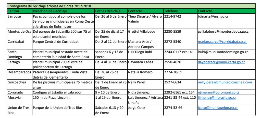 Las municipalidades que recolectarán los arbolitos son: San José, Montes de Oca, Curridabat, Santo Domingo, Cartago, Desamparados, Goicoechea, Coronado, Moravia y Unión de Tres Ríos.
