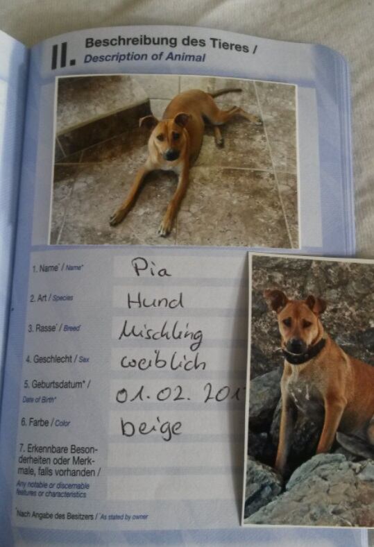 Pía, quien nació como indigente y vivió así los dos primeros meses de su vida, ahora, con cuatro años, vive como una princesa en Hamburgo, Alemania. Es una perrita tica con pasaporte alemán, conoce varios países de las Europas: Francia, España, Bélgica.