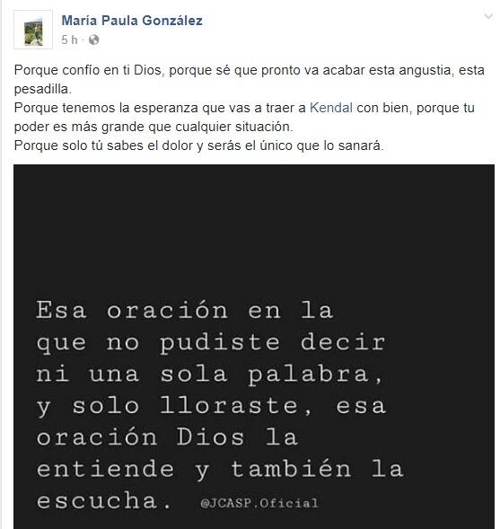 En la páginas de Facebook varios allegados han pedido oraciones y unión para dar con Kendal. Aseguran que no pierden la esperanza de encontrarlo vivo.