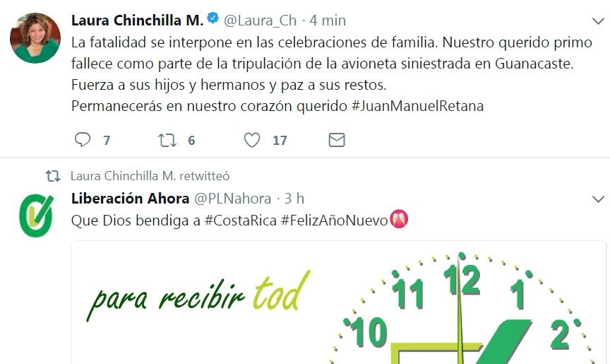 Así lo dio a conocer Chinchilla por medio de su cuenta oficial de Twitter, en donde dijo que “la fatalidad se interpone en las celebraciones de familia”, pues su primo Juan Manuel Retana, de 52 años, era uno de los 12 fallecidos.
