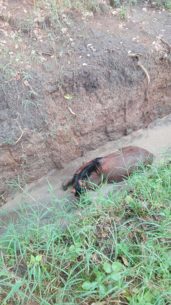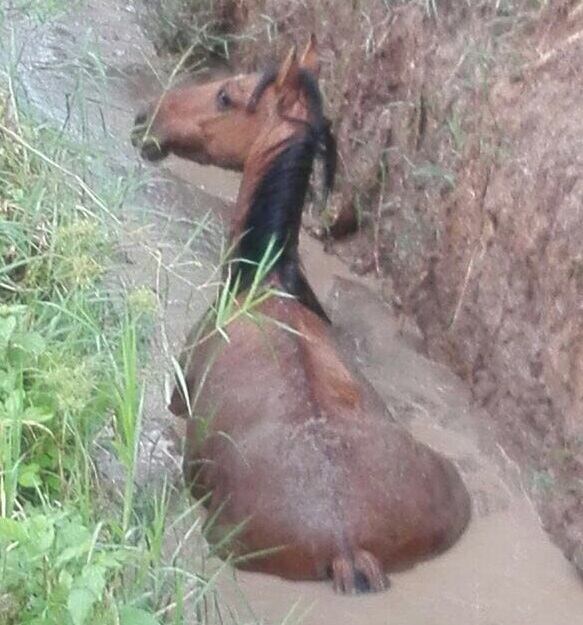 La potranca quedó atrapada en un canal de desagüe, el cual estaba lleno de agua debido a los aguaceros de los últimos días.
