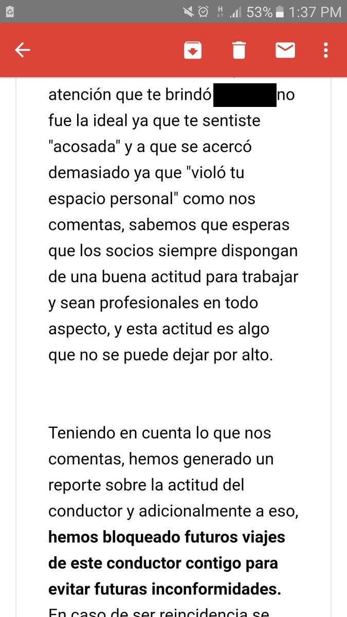 El conductor solamente fue bloqueado de brindar el servicio a la usuaria que denunció el caso, a pesar de que este tipo de conductas podría penalizarse de forma tal que la persona pierda el acceso a su cuenta, según indican las Guías Comunitarias de Uber.