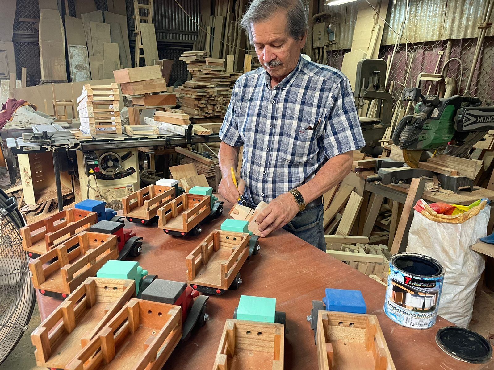En este momento en su taller, Fábrica de Muebles El Sabanillo, don Luis tiene un inventario de 50 carritos a escala y tiene la fe de que de aquí a diciembre se le vayan todos.