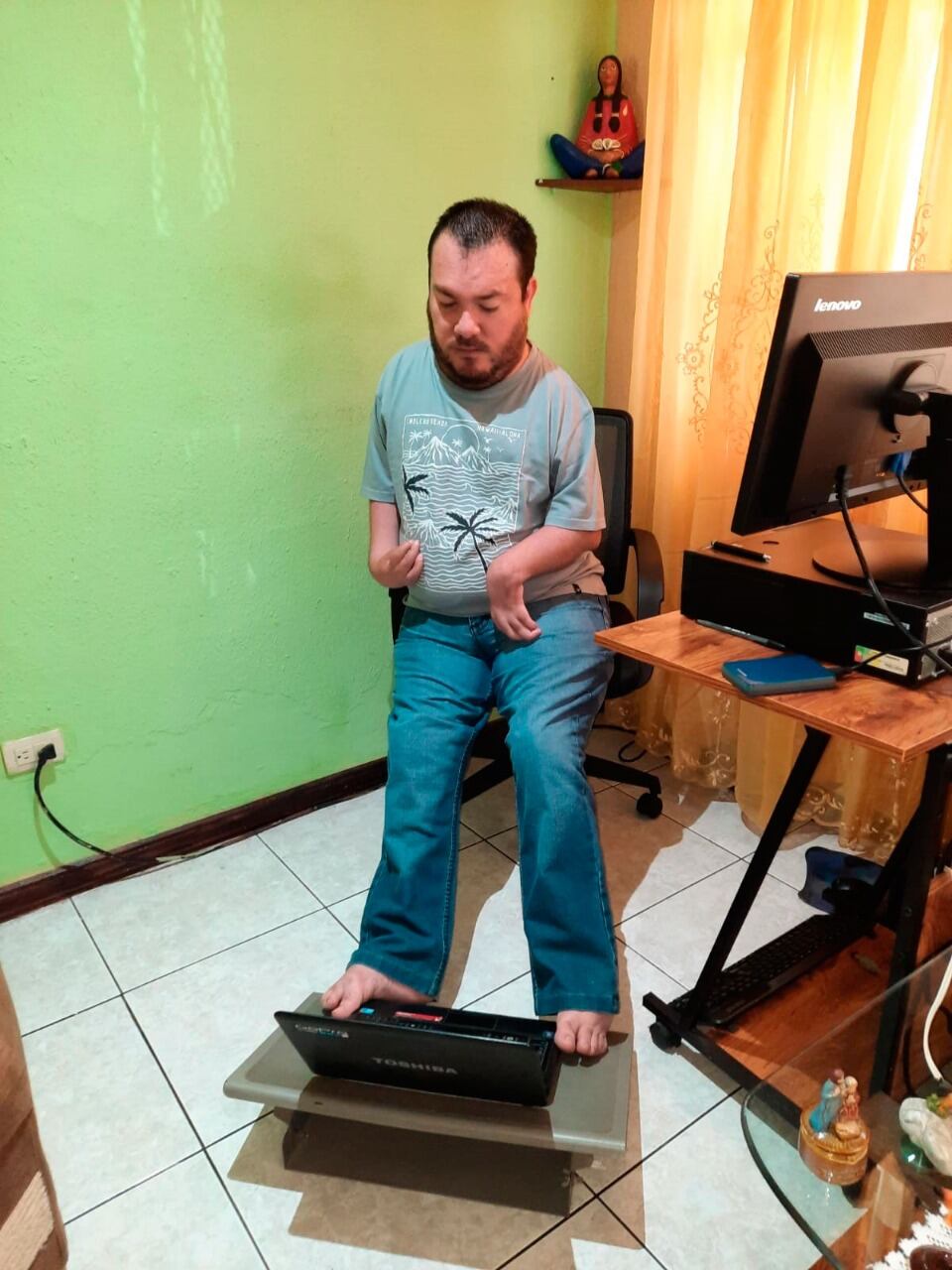 En el caso de Luis Carlos, el movimiento de sus manos es muy limitado, por eso ha aprendido a usar sus pies para labores como manipular el celular y la computadora, entre otras cosas.