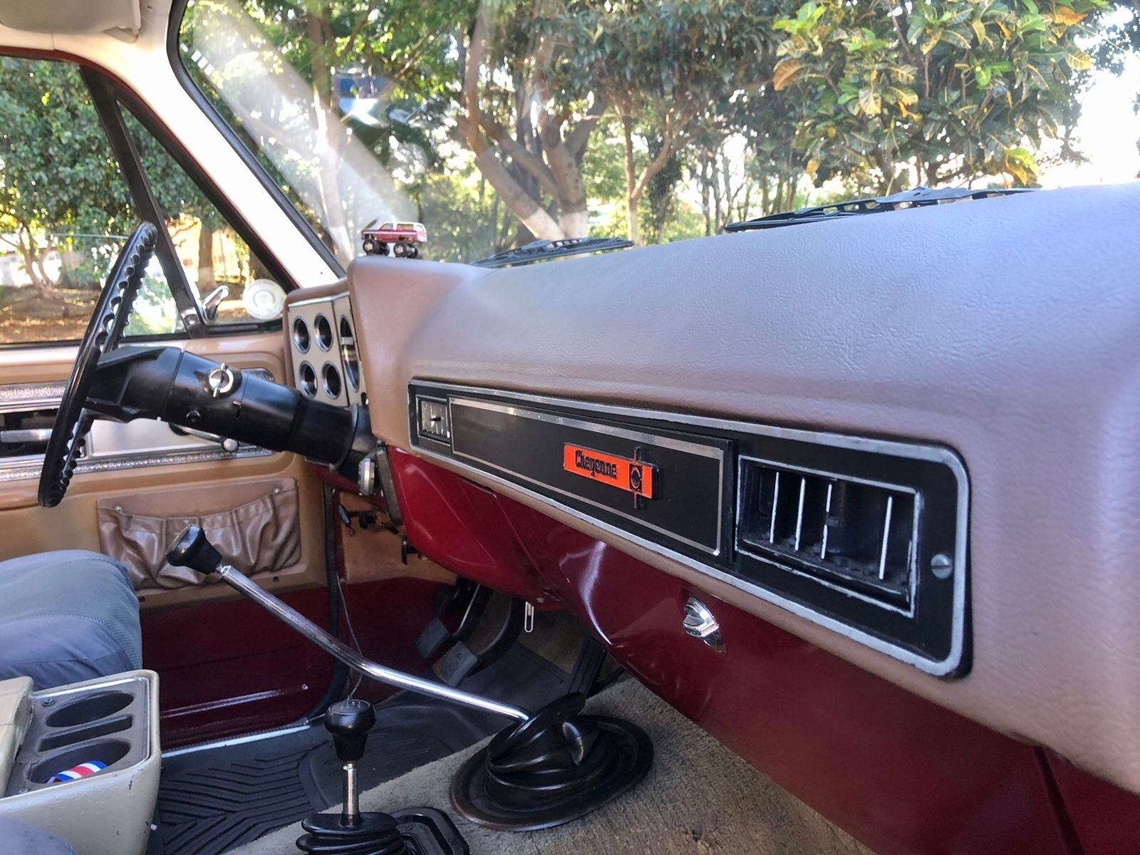 Este Chevrolet es doble tracción, 4x4, la caja de cambios es manual, el dash mantiene el color café original. El radio lo tiene guardado, pues le puso uno más moderno que tiene entrada para llave maya y así puede escuchar música de Led Zeppelin, Rolling Stones, Elvis Presley y AC/DC.