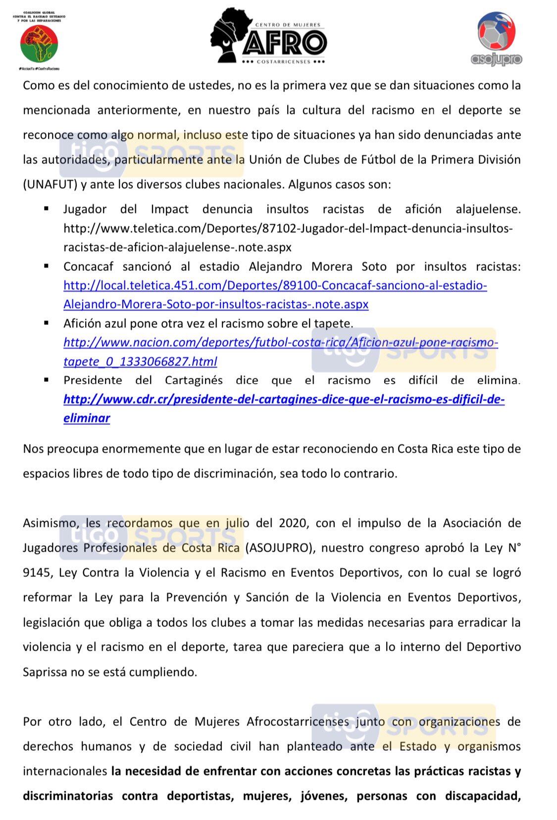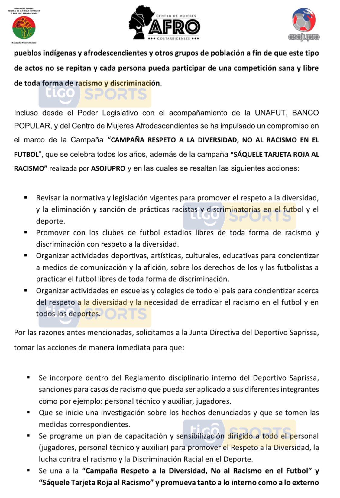 “Hemos sido informados que esta semana durante un entrenamiento del equipo del Saprissa, el señor Jeaustin Campos, director técnico de su representada, utilizó varios adjetivos calificativos racistas como por ejemplo: “Negro bastardo”, “Negro de mier...” para llamarle la atención al jugador Javon East. Dicho jugador buscó apoyo en el gerente deportivo, el señor Ángel Catalina, quien le respondió que en “Costa Rica es muy normal que a los jugadores negros los traten de esa forma”, dice la nota.