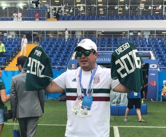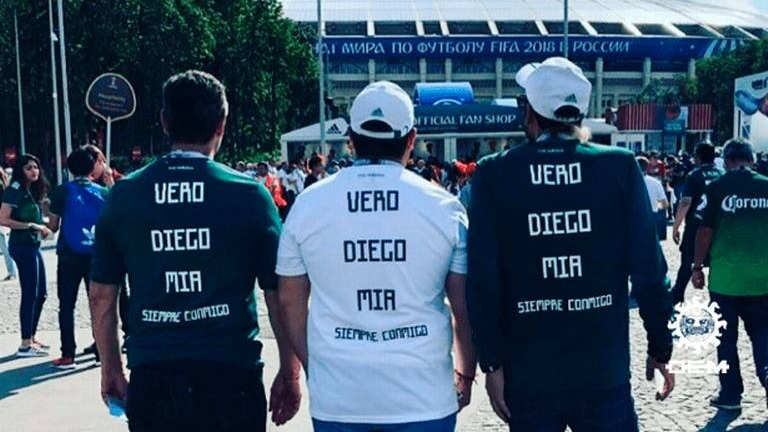 Los tres hombres fueron con una camiseta con la inscripción, "Vero, Diego, Mía, siempre contigo" , mientras que Gilberto colgaba consigo las cuatro acreditaciones y así vio el partido inaugural de los aztecas ante Alemania, el 17 de junio en Moscú, el Día del Padre.