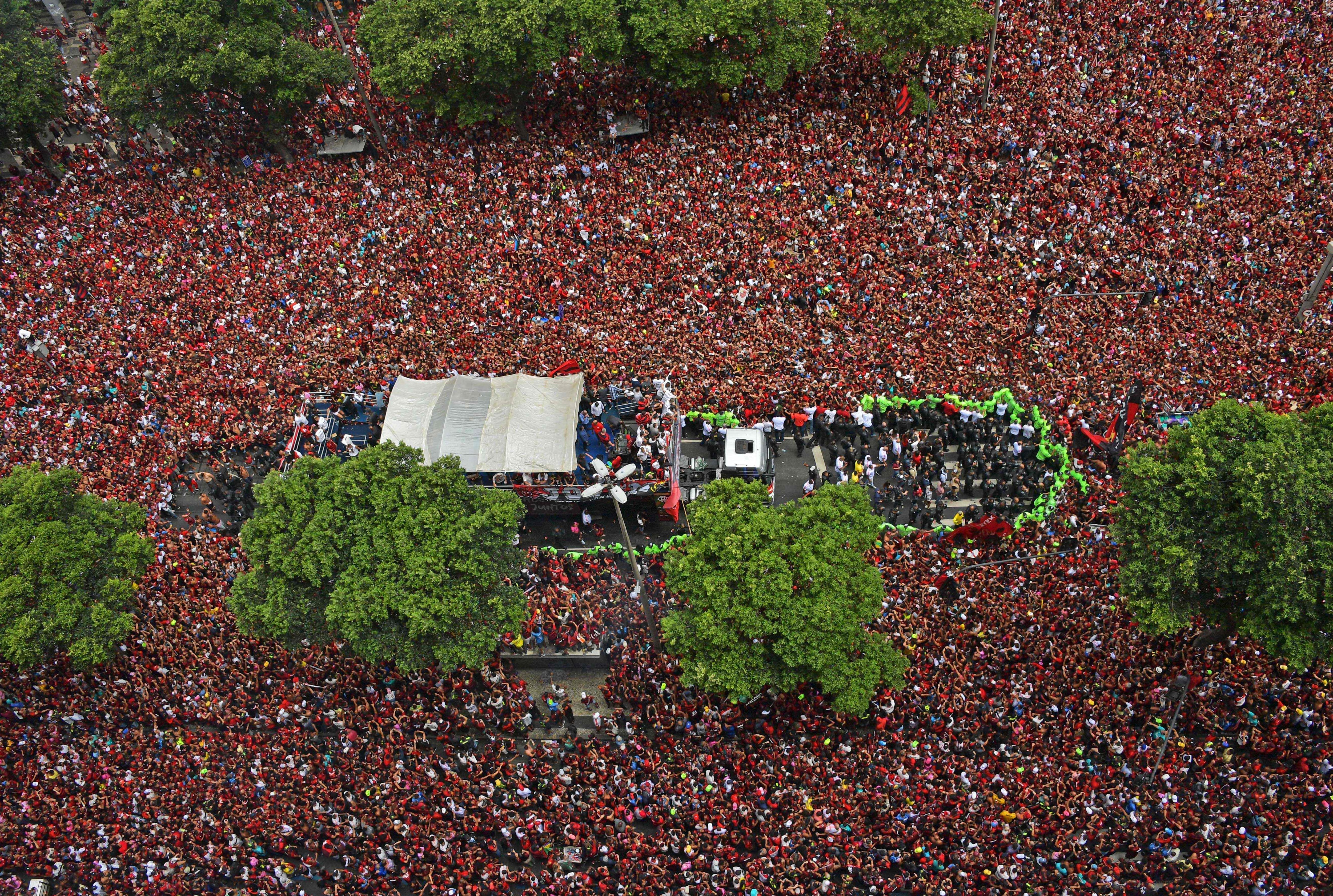 Luego de aterrizar por la mañana en el aeropuerto internacional de Río de Janeiro, la expedición de Flamengo, rodeada de un gran dispositivo de seguridad, se dirigió en un bus hasta el centro de la ciudad, donde cambió de vehículo y en un bus descapotable inició un lento recorrido de poco más de un kilómetro y medio hasta el monumento Zumbi dos Palmares, en la misma avenida Presidente Vargas.