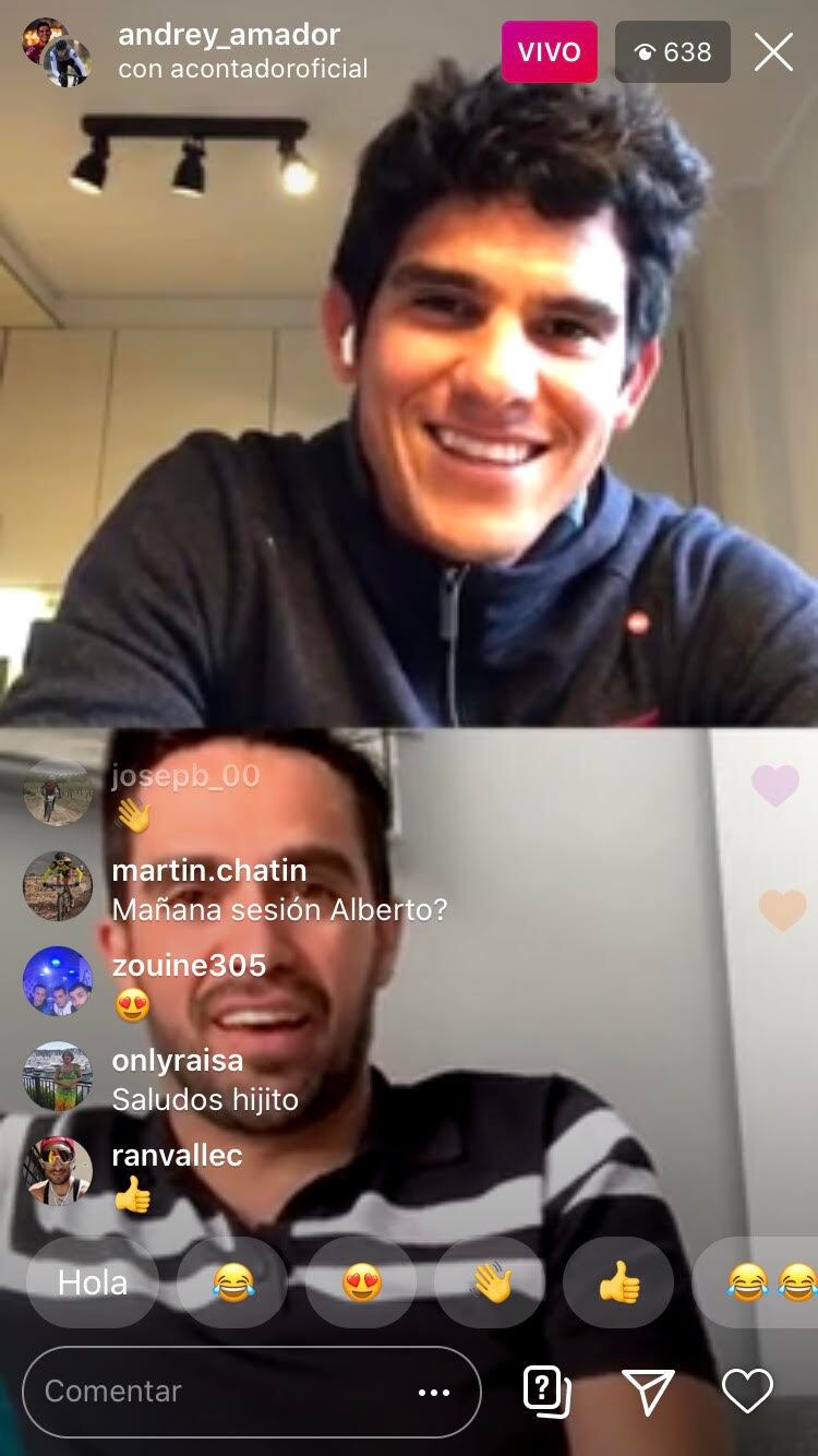 Contador --ganador de las tres grandes pruebas del ciclismo como lo son el Giro, el Tour y la Vuelta-- conversó con Amador y con los que estaban conectados. Contador constantemente alabó el trabajo de Andrey desde que este pisó suelo europeo.