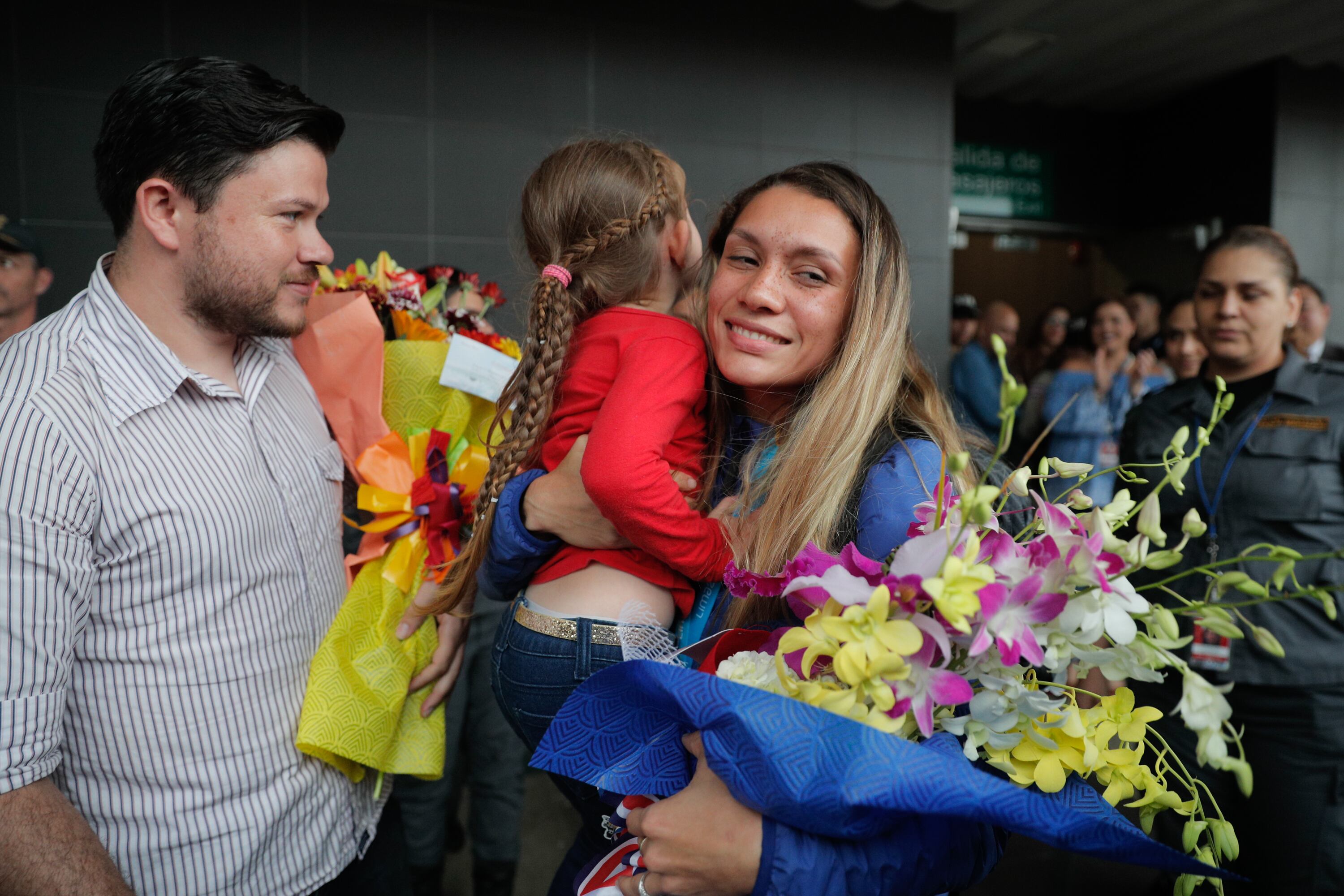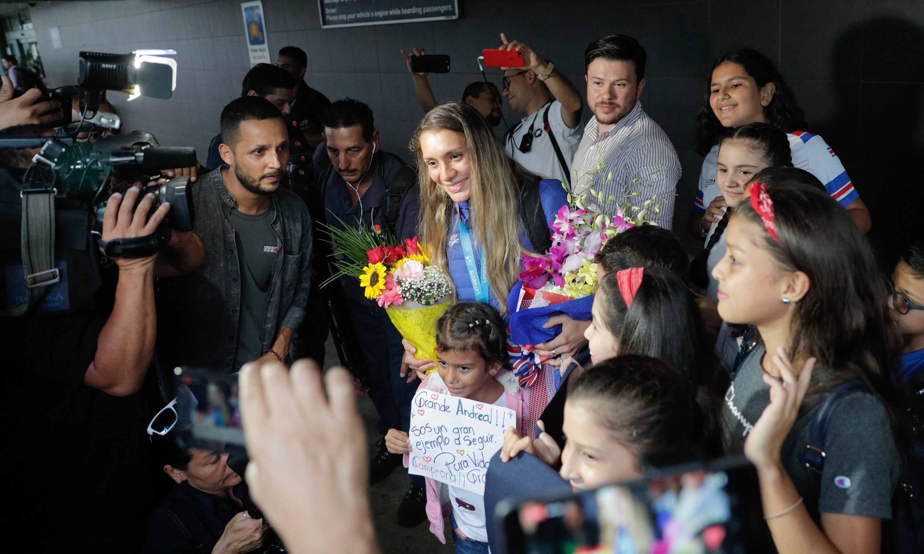 Tranquila y feliz por encontrarse con su esposo e hija, la atleta Andrea Vargas llegó este viernes por la tarde al país, después de haber obtenido la medalla de oro en los 100 metros con vallas de los Juegos Panamericanos de Lima 2019.