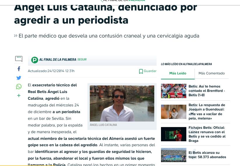 El hoy gerente deportivo del Saprissa era entonces miembro de la secretaría técnica de la Unión Deportiva Almería y fue denunciado en la comisaría de La Alameda (Sevilla) “después de agredir a un periodista en un bar”, informó entonces la agencia de noticias EFE.