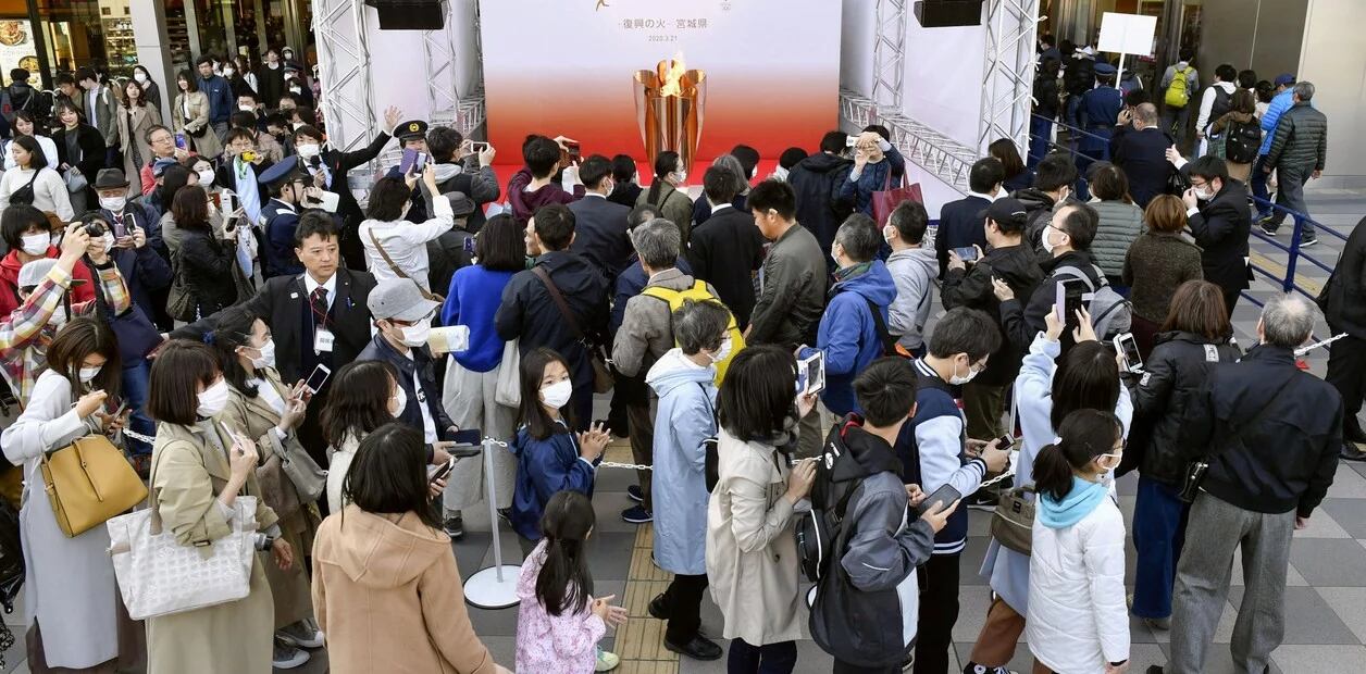 Enormes multitudes se detuvieron para ver la llama olímpica cuando se puso en exhibición en la estación de tren de Sendai en la ciudad de Miyagi, a pesar de los consejos de aislamiento.