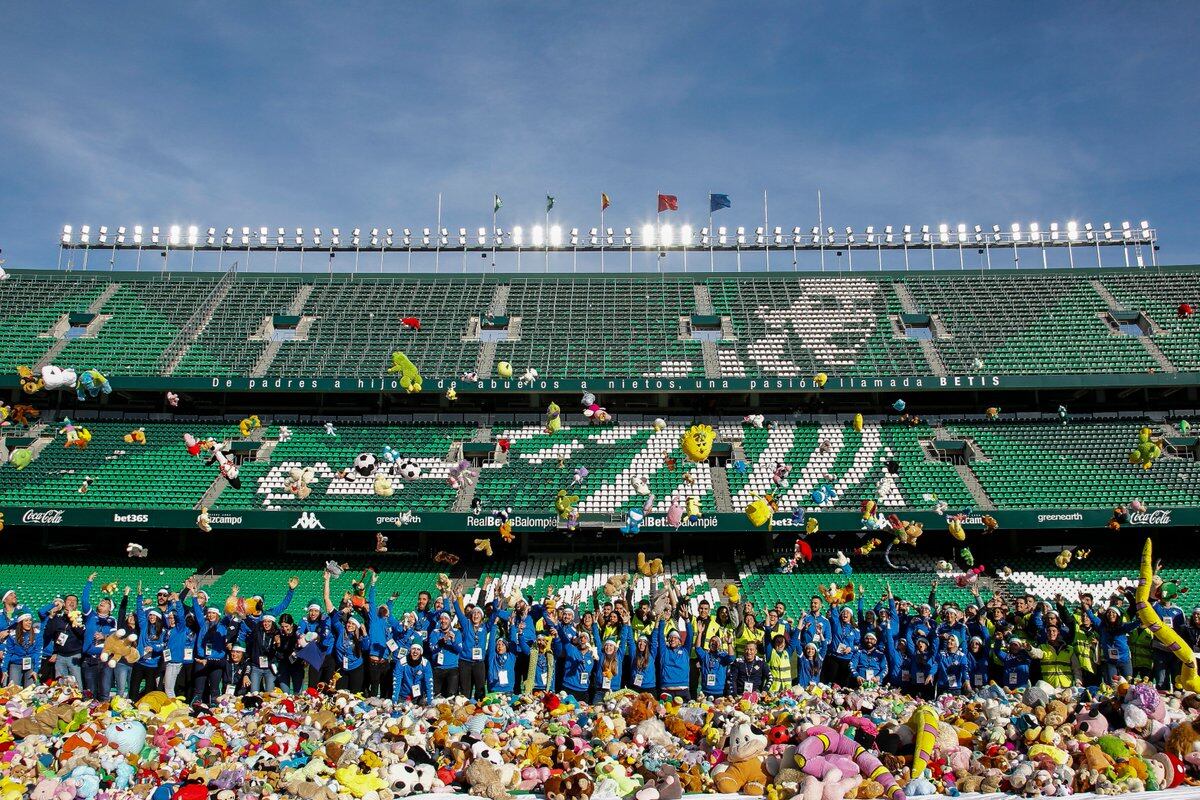 La iniciativa, puesta en marcha durante esta semana, tuvo un gran final con el lanzamiento masivo de peluches que llenaron la zona de césped más próxima a los graderíos. Nota perfecta para el Betis y para su incansable y siempre leal afición. Los aficionados realizaron sus tiernas donaciones coincidiendo con el final del primer tiempo.