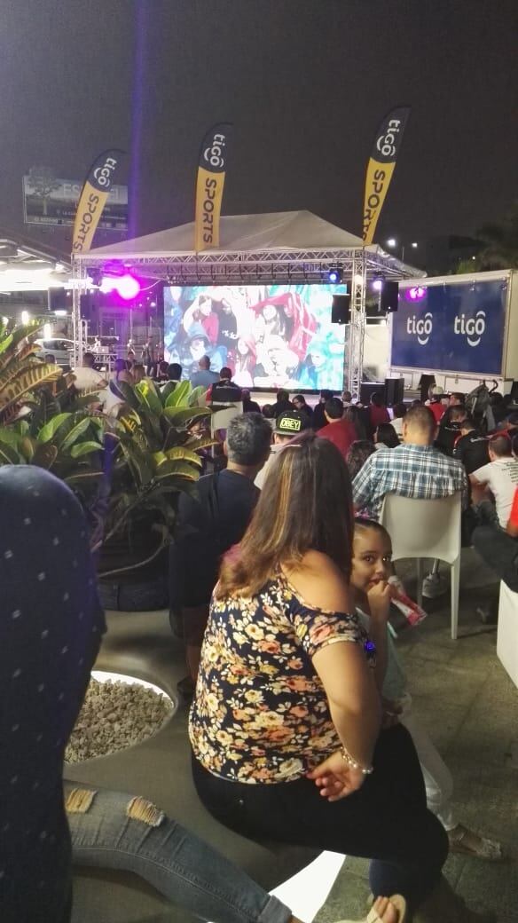 En el centro de la Liga, Tigo habilitó dos pantallas gigantes, una en la entrada del City Mall y otra en el estadio Morera Soto, donde se cobraba dos rojos la entrada al público en general y mil a socios.