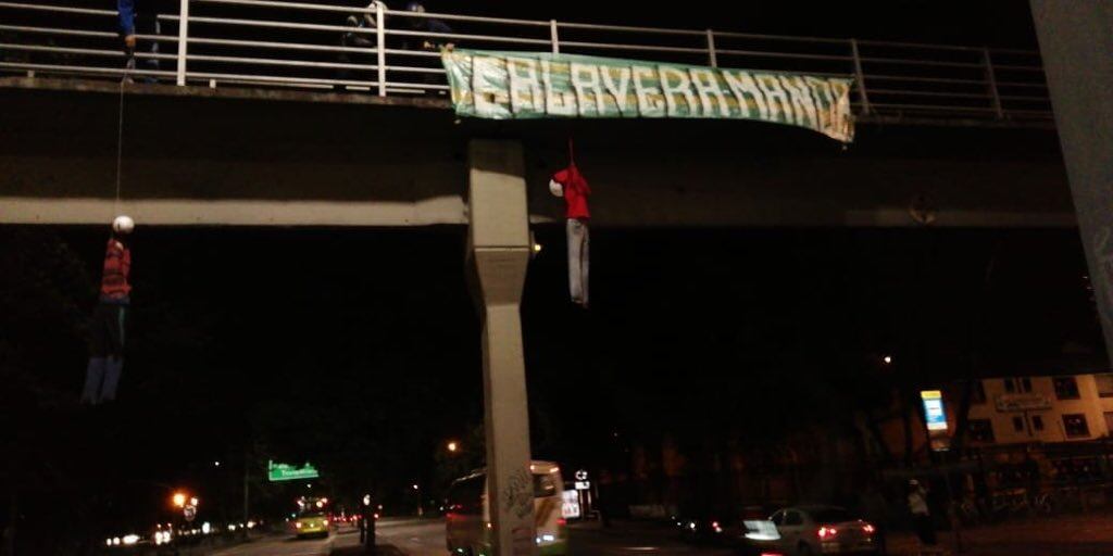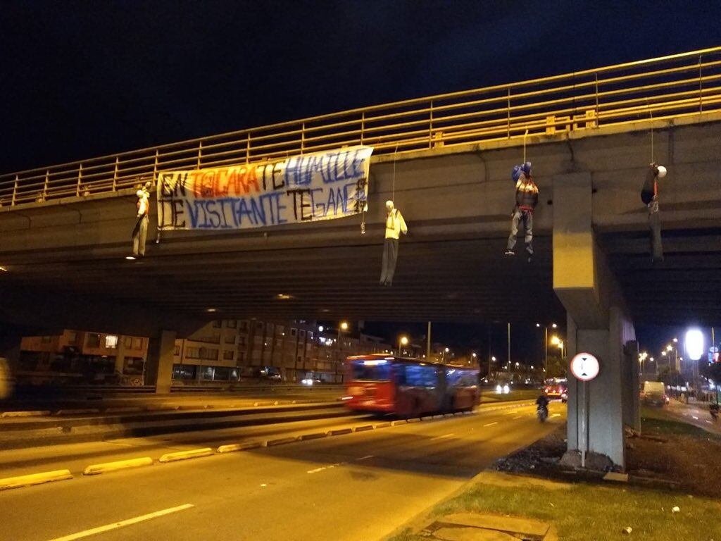 Se trató de muñecos que algunos fiebres radicales guindaron en algunos puentes en inmediaciones al estadio El Campín, y los que les pusieron chemas del Santa Fe.