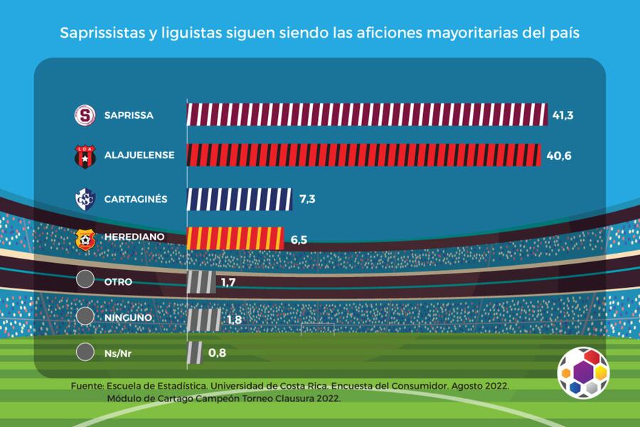 — El 41,3 por ciento de los aficionados afirmaron ser saprissistas y en segundo lugar están los manudos, que representaron el 40,6 por ciento de los consultados. El tercer lugar lo ocupa Cartaguito, con el 7,3 por ciento de los aficionados y Herediano está en el cuarto puesto, con un 6,5 por ciento de apoyo.