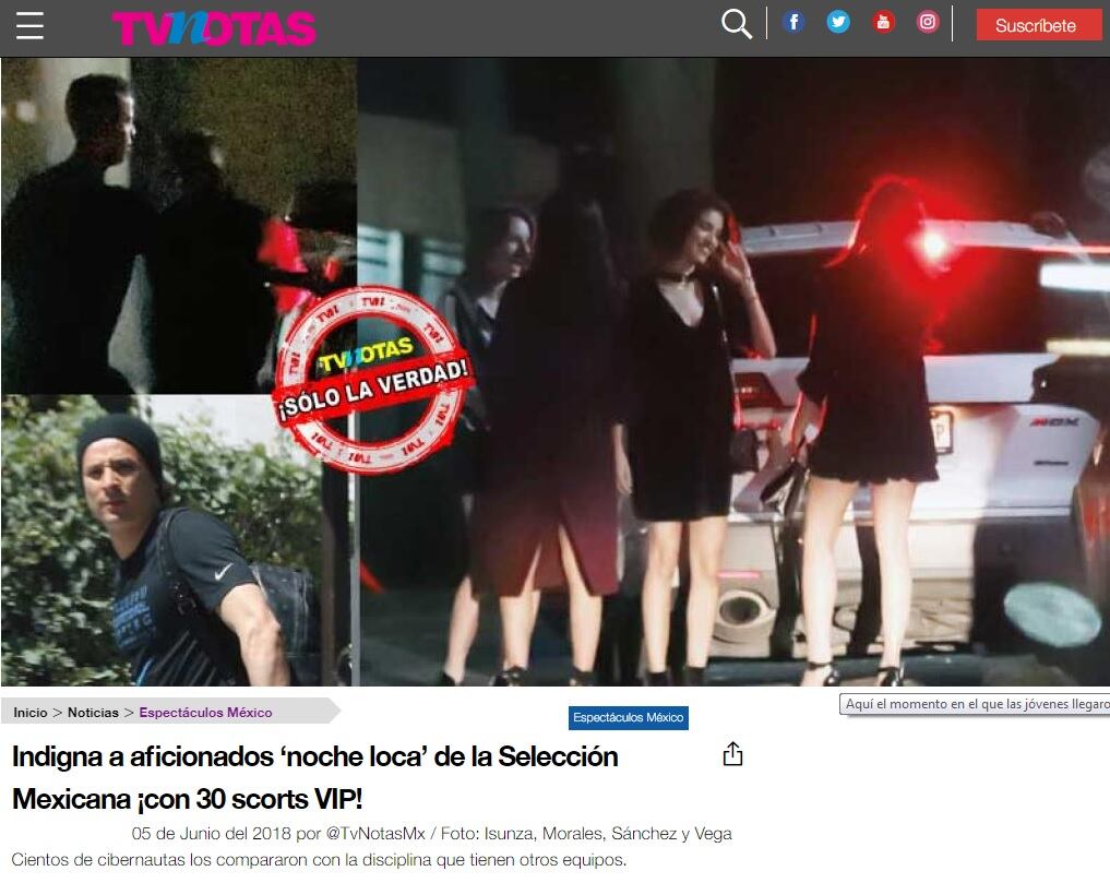 El martes pasado, la revista de espectáculos azteca TV Notas informó de la "fiesta de despedida" de los futbolistas mexicanos, antes de viajar al Mundial de Rusia, en una pachanga que duró 24 horas y donde comentaron que solo habían estado nueve futbolistas, aunque al final se supo que habían estado 22.