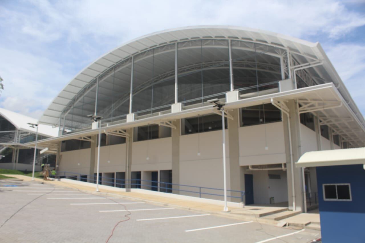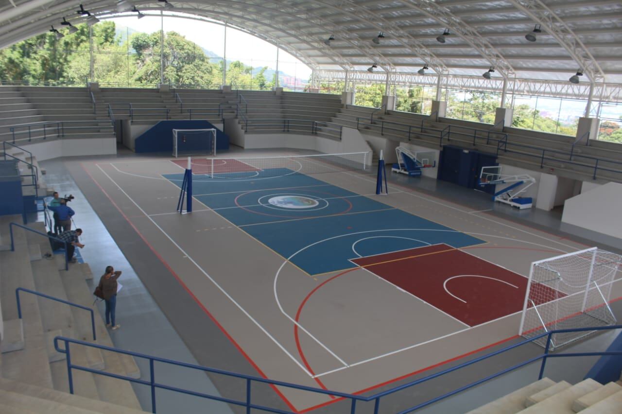 La edificación tiene camerinos con duchas y baños especiales para personas con discapacidad. Todo el equipamiento como marcos, mallas, tableros y el piso de la cancha fueron importados de Europa.