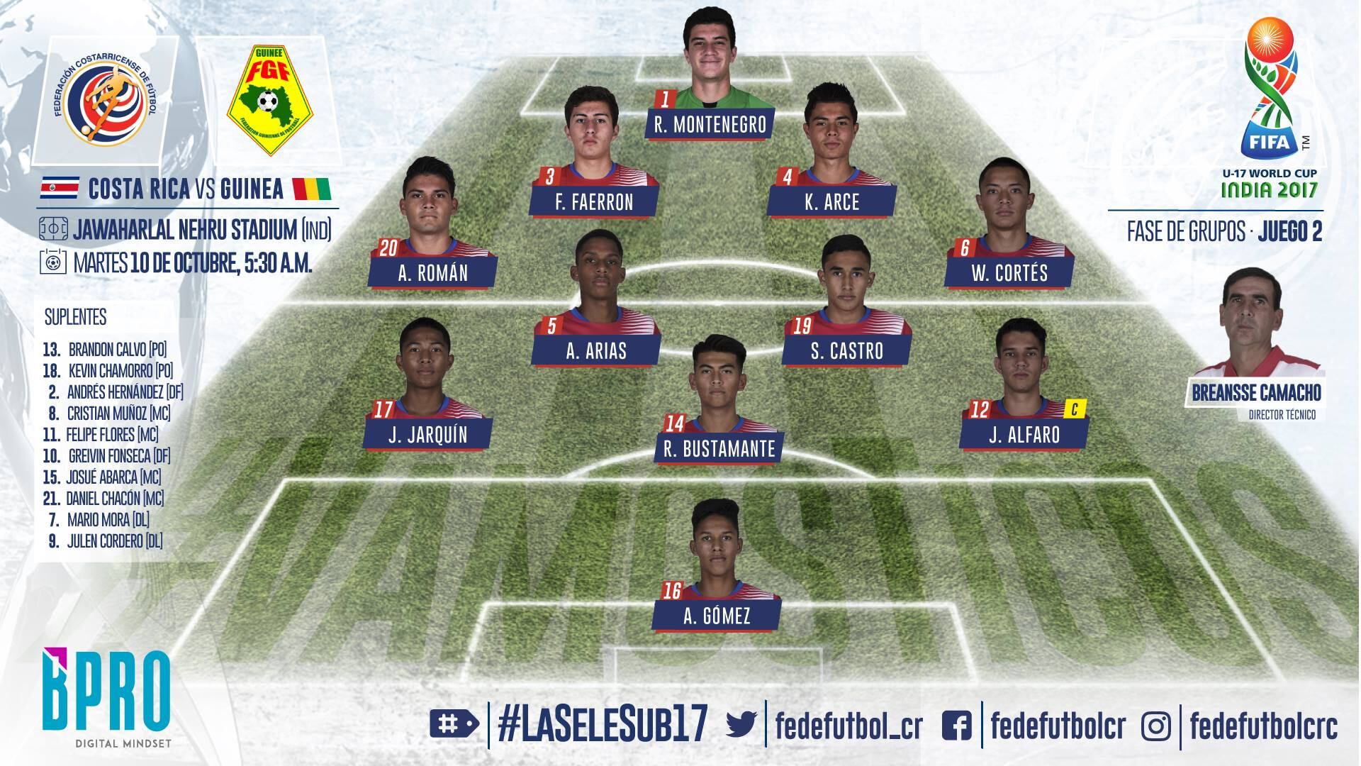 La Selección Nacional Sub-17 de Costa Rica empató 2-2 con la de Guinea en el segundo partido de ambas, en el Grupo C, de la fase de grupos de la Copa Mundo de la FIFA India 2017.