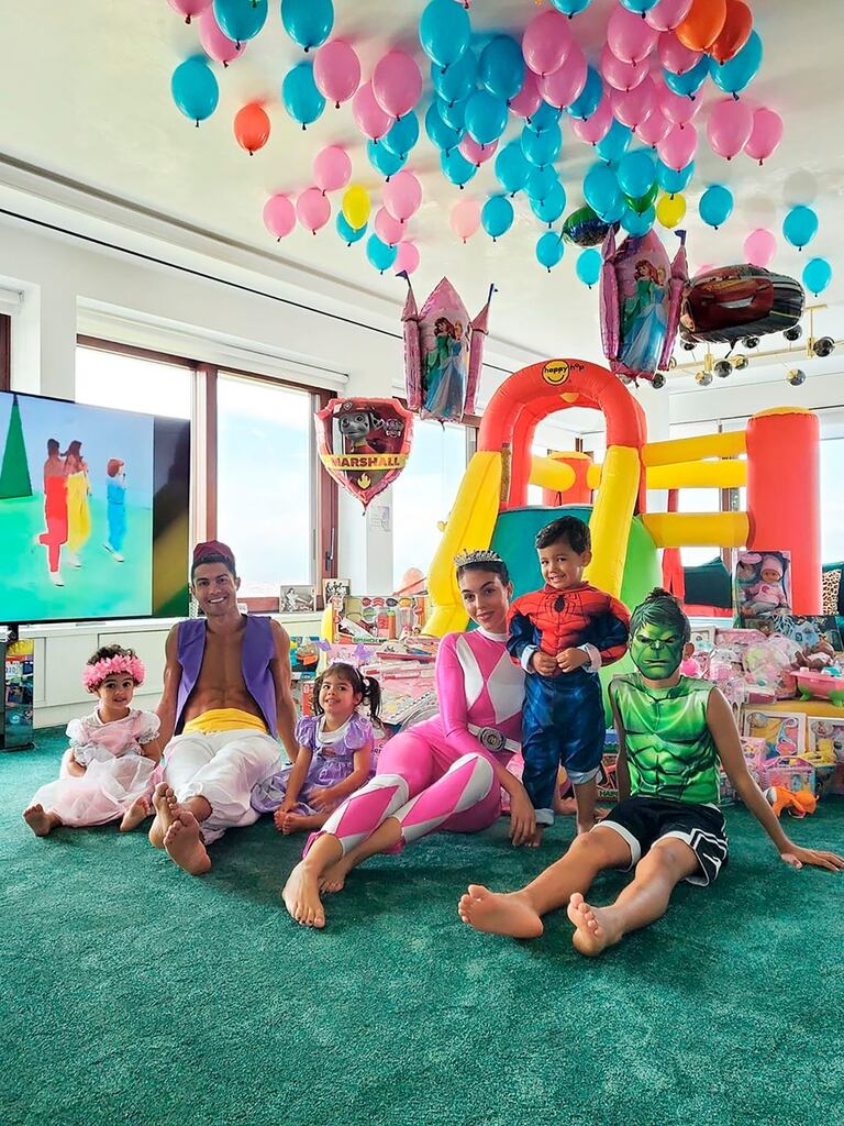 En la imagen se ve a Cristiano disfrazado de Aladino, el célebre personaje del libro Las mil y una noches. Georgina está vestida como la Power Ranger rosa; el hijo Mayor, Cristiano Jr., es Hulk y Mateo -uno de los homenajeados de la jornada- es Spiderman.