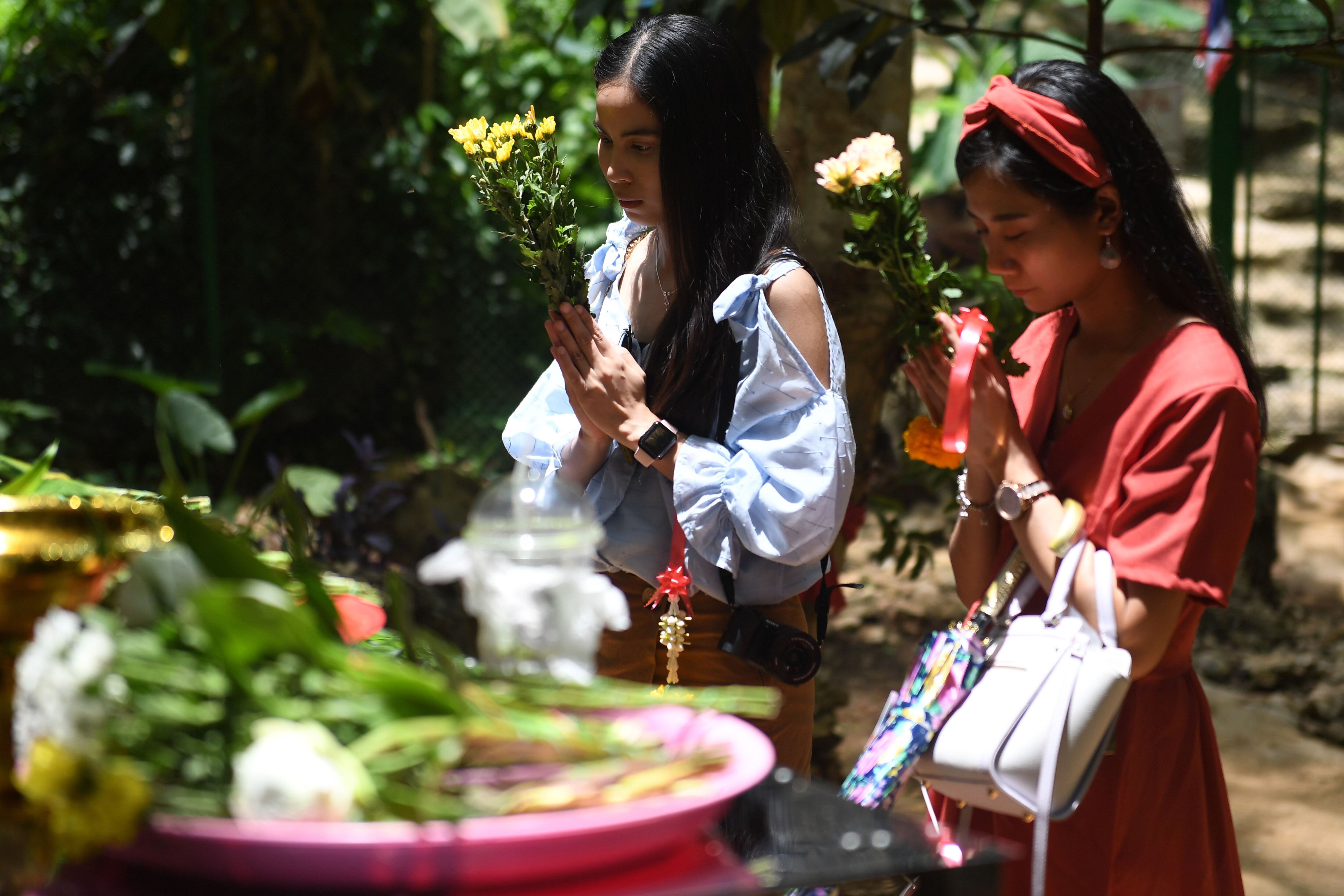 Sumalee deposita flores blancas y se inclina ante la estatua de Saman Kunan, el buzo que murió durante el espectacular rescate de jóvenes futbolistas y su entrenador.