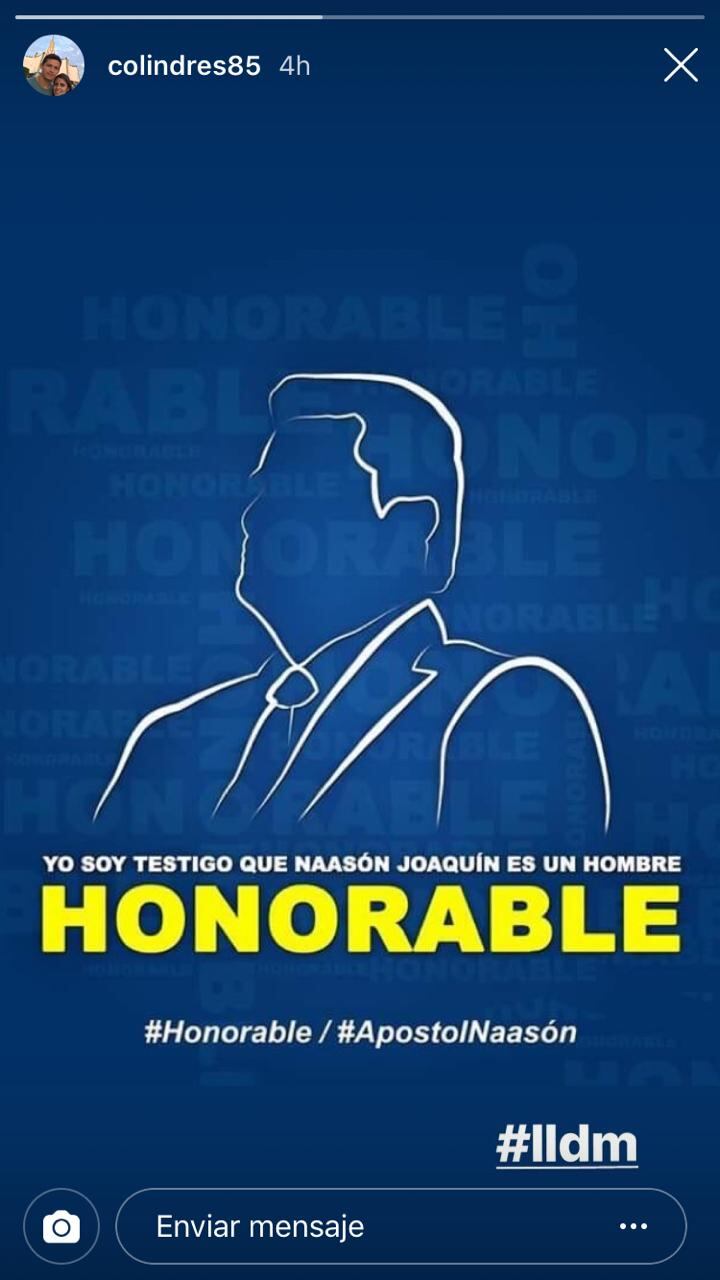 “Yo soy testigo que Naasón Joaquín es un hombre honorable”, dice una fotografía que publicó el exmorado en sus historias de Instagram.