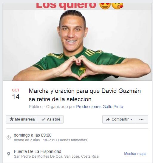 El evento se llama “Marcha y oración para que David Guzmán se retire de la Selección”, está programado para este domingo en la fuente de la Hispanidad en San Pedro de Montes de Oca. Lo curioso es que la iniciativa tiene a más de 6.000 personas interesadas en participar.