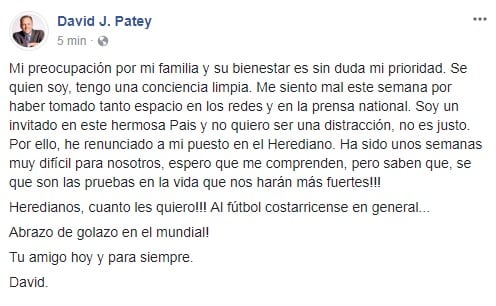 "Mi preocupación por mi familia y su bienestar es sin duda mi prioridad. Sé quien soy, tengo una conciencia limpia. Me siento mal esta semana por haber tomado tanto espacio en las redes y en la prensa nacional. Soy un invitado en este hermosa país y no quiero ser una distracción, no es justo. Por ello, he renunciado a mi puesto en el Herediano. Has sido unas semanas muy difíciles para nosotros, espero que me comprendan, pero sé que las pruebas en la vida las que nos harán más fuertes", indicó.