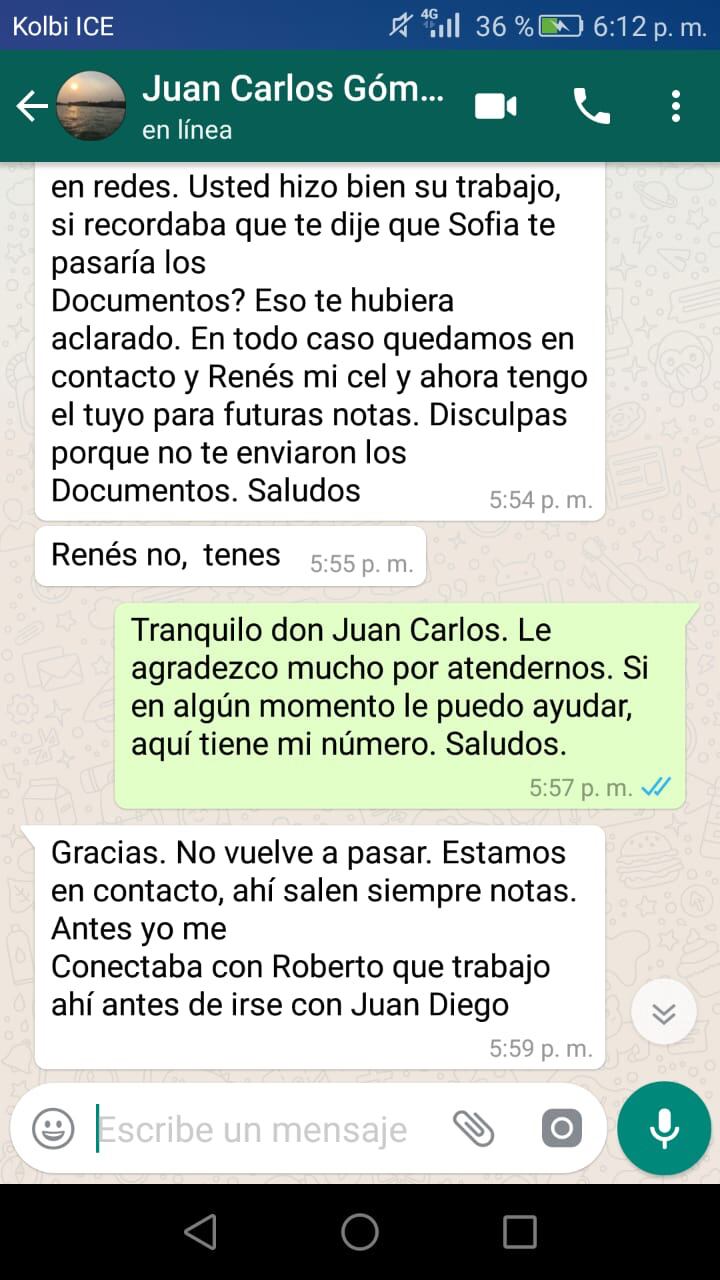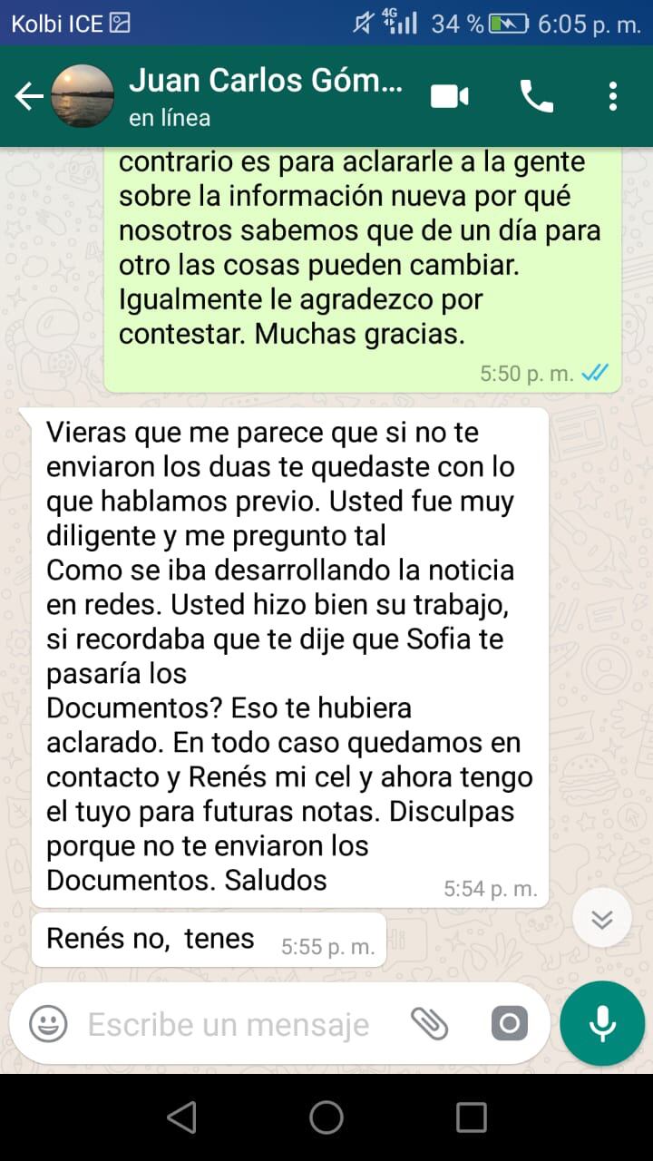 Los documentos que el funcionario ofreció mandar al diario no llegaron. El diario dio por ciertas sus palabras, dichas con mucha seguridad y con aparente conocimiento de causa. En uno de los mensajes de WhastApp del sábado Gómez incluso ofrece disculpas por no haber enviado esos documentos (a los que llama duas). “Si no te enviaron los duas te quedaste con lo que hablamos previo”.