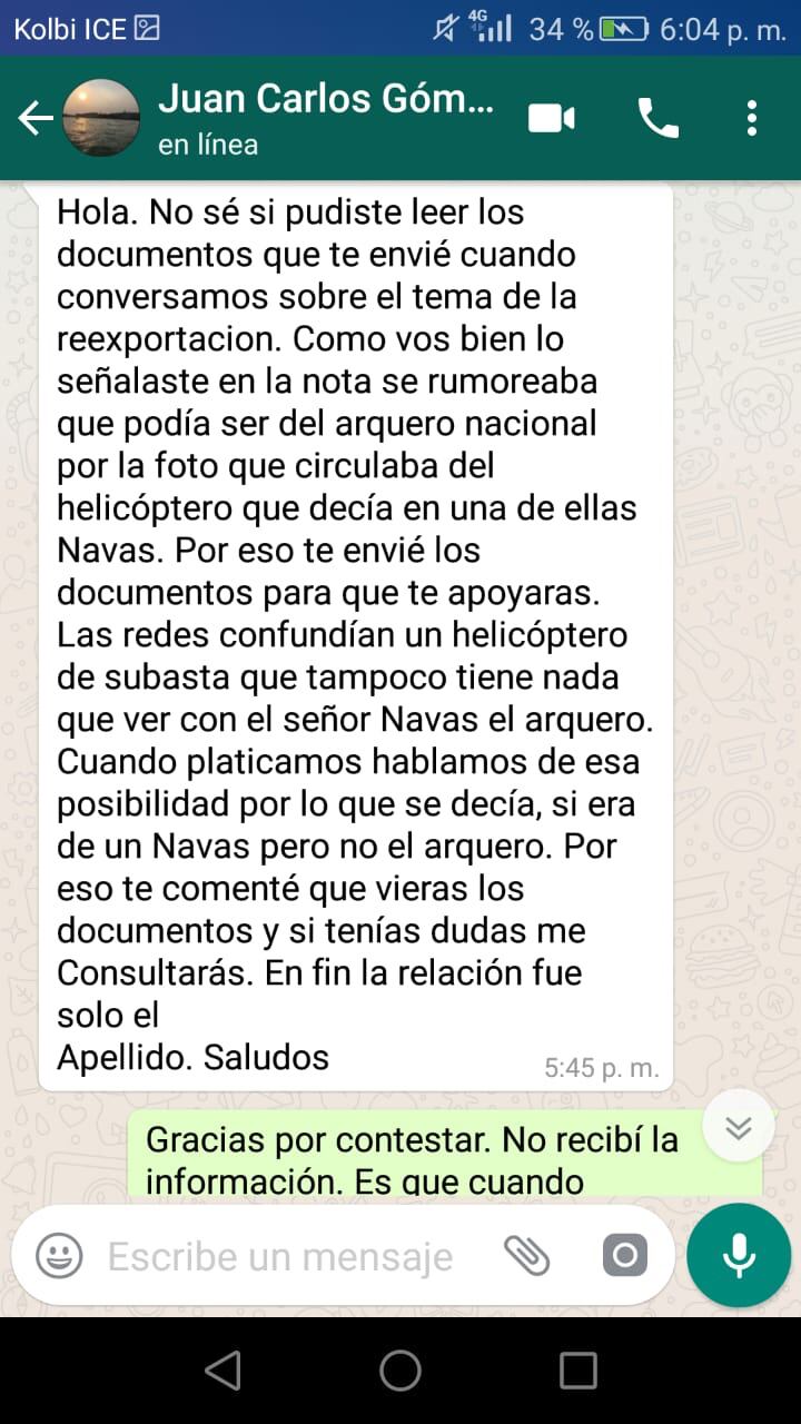 En ese intercambio de mensajes, Gómez menciona unos documentos que iban a ser enviados al diario el viernes después de haber conversado con él y en los cuales, supuestamente, se daban detalles relacionados con los dos helicópteros mencionados en los rumores y que dejaban claro dónde estaba la confusión.