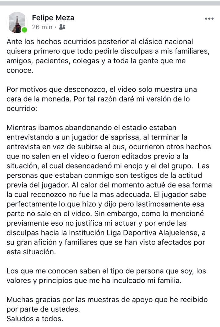 "Sin embargo, como lo mencioné previamente, eso no justifica mi actuar y, por ende, las disculpas hacia la institución Liga Deportiva Alajuelense, a su gran afición y familiares que se han visto afectados por esta situación.