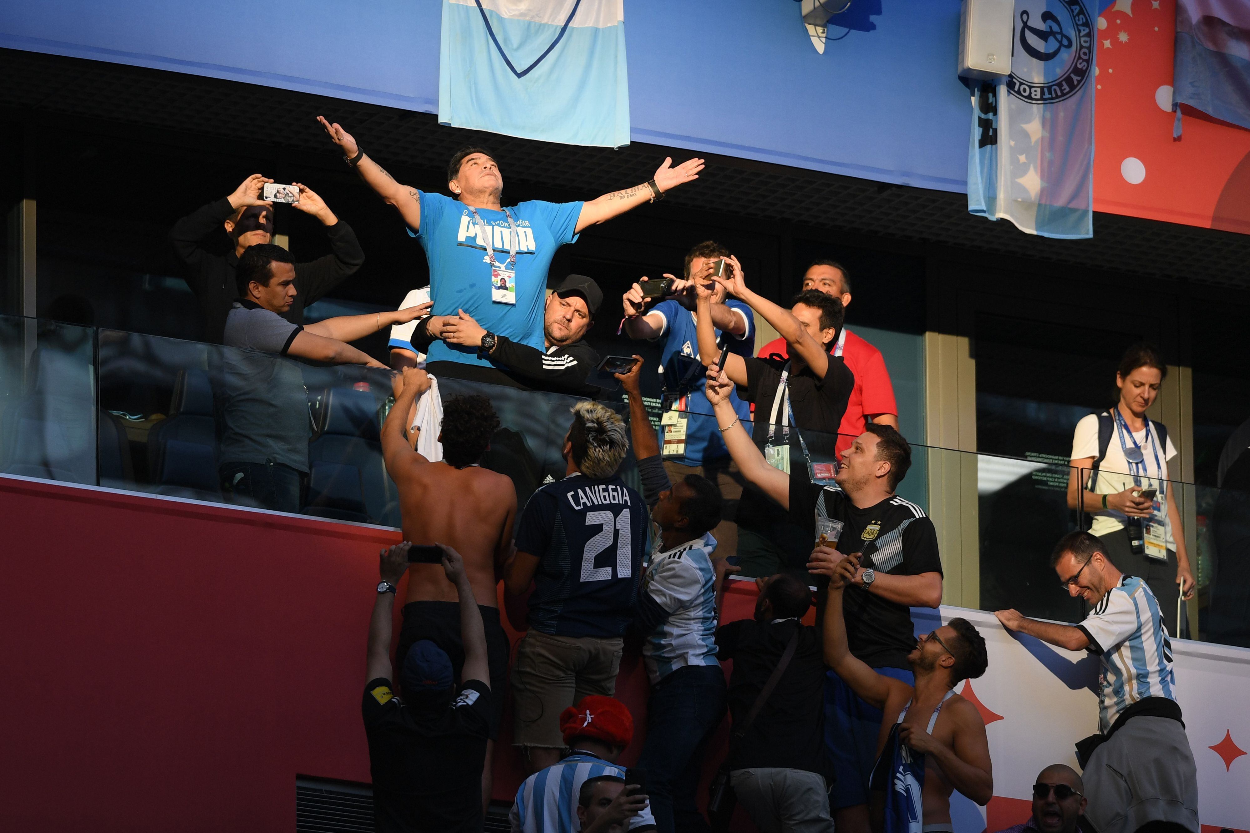 Cada vez que una cámara lo enfoca, el exjugador hace un montón de caras y gestos. Algunas veces parece dormido, otras que está muy enojado, de momentos pareciera que se va a caer de su palco o hasta le hizo un gesto obsceno a los aficionados después del segundo gol de la albiceleste ante Nigeria (2-1) que les dio la clasificación a octavos.