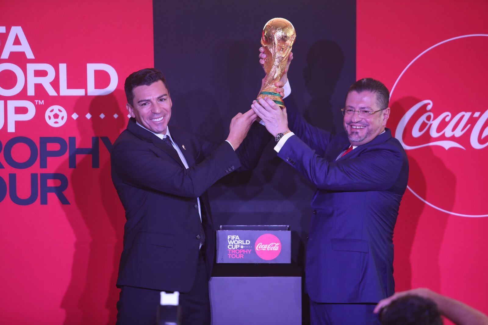 El presidente de la República, Rodrigo Chaves, recibió la Copa del Mundo, en compañía de Lucio, el brasileño que acarició el trofeo con su selección, la de Brasil, en el Mundial de Corea - Japón 2002.