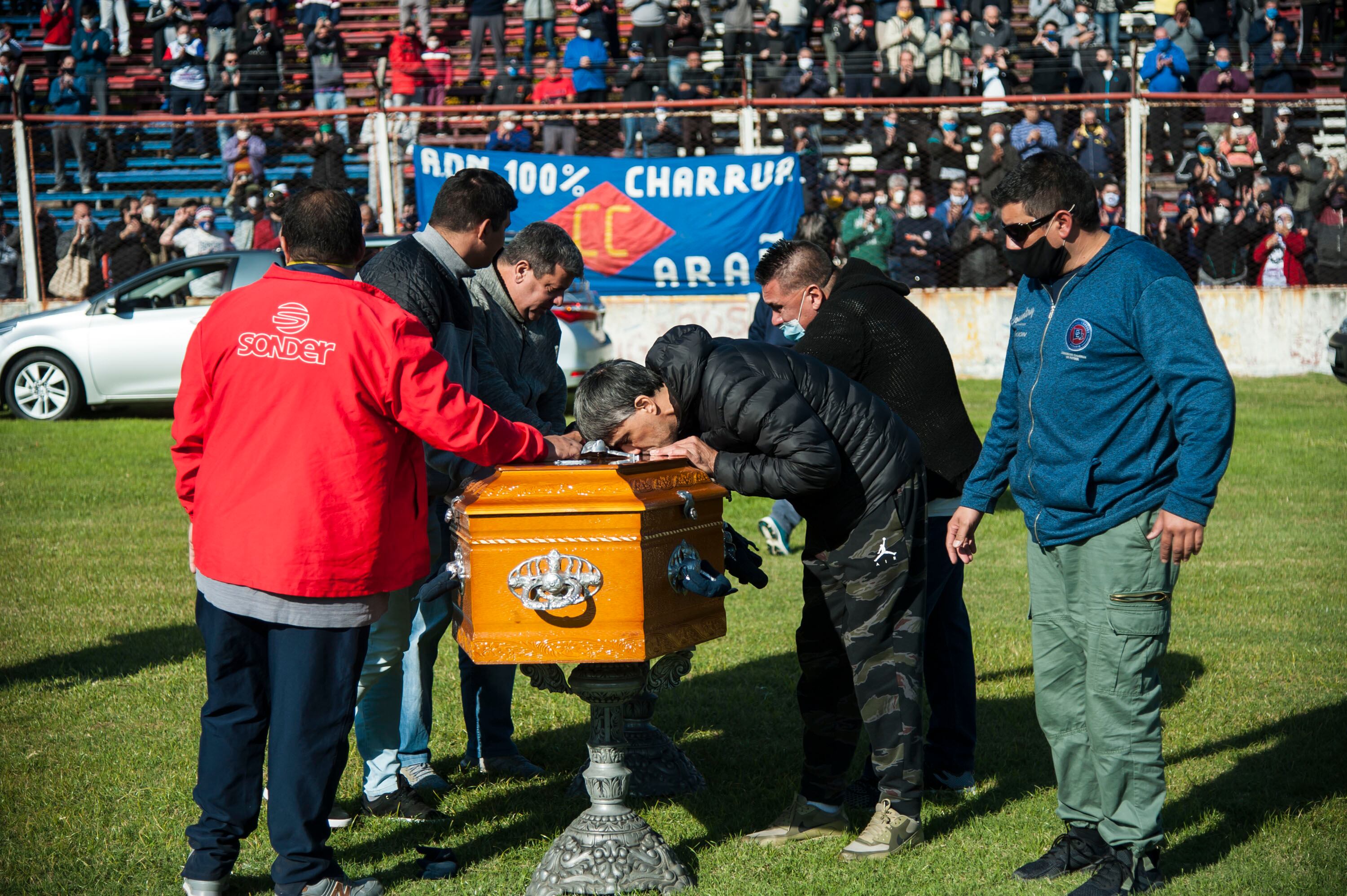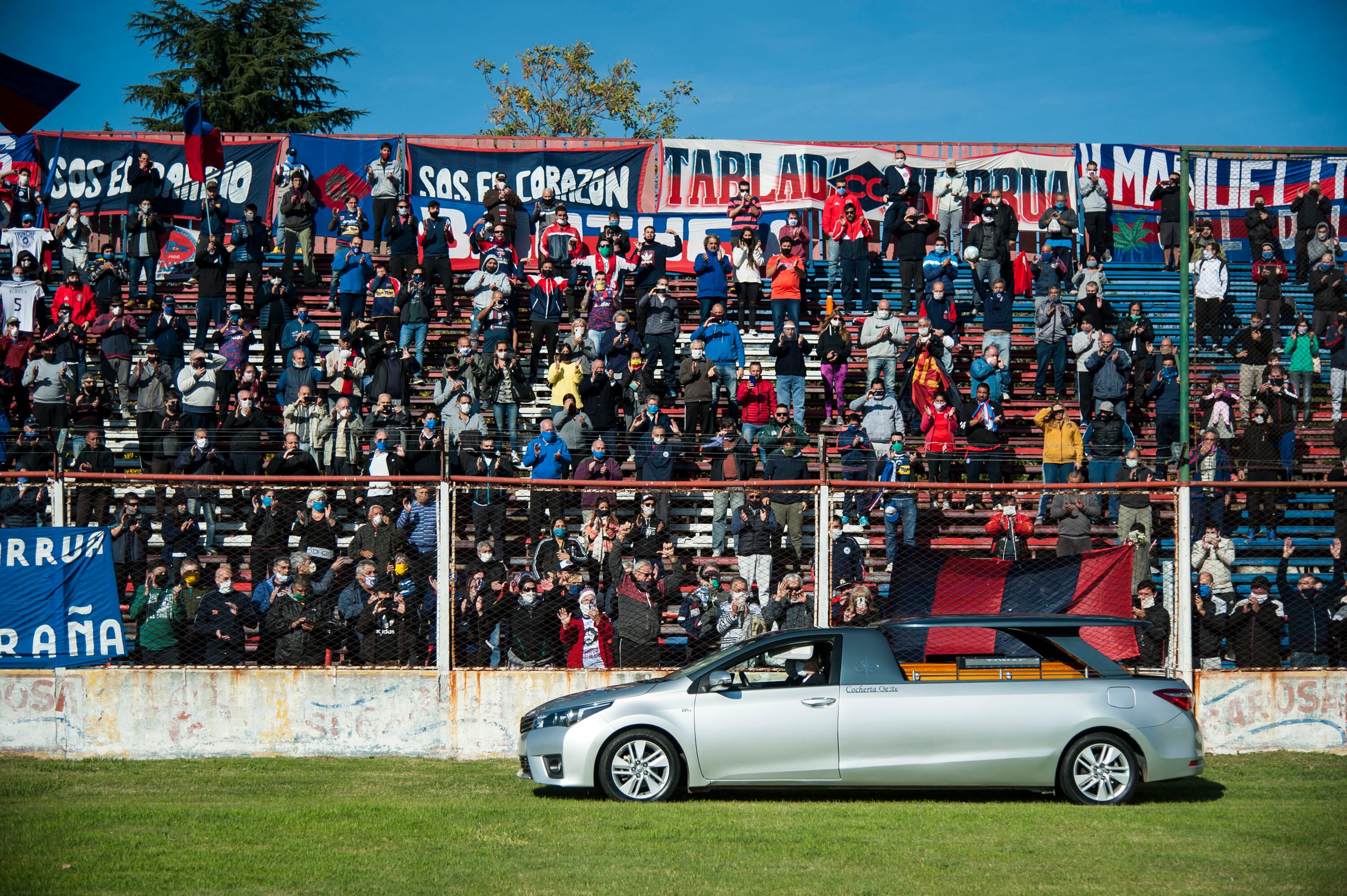 Su féretro fue llevado en un auto fúnebre hasta el centro de la cancha, se lo colocó en el césped, con una pelota de fútbol encima, para su último adiós.