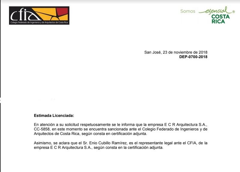 “Se encuentra sancionada disciplinariamente por violación al Código de Ética del CFIA, según los acuerdos de la Junta Directiva General... por un periodo de 12 meses, la cual rige a partir del 17 de abril del 2018 y hasta el 17 de abril del 2019. Por lo cual al día de hoy se encuentra inhabilitada para el ejercicio profesional ante el Colegio Federado de Ingenieros y de Arquitectos de Costa Rica”, señala el documento del ente que supervisa la correcta labor de estos profesionales.