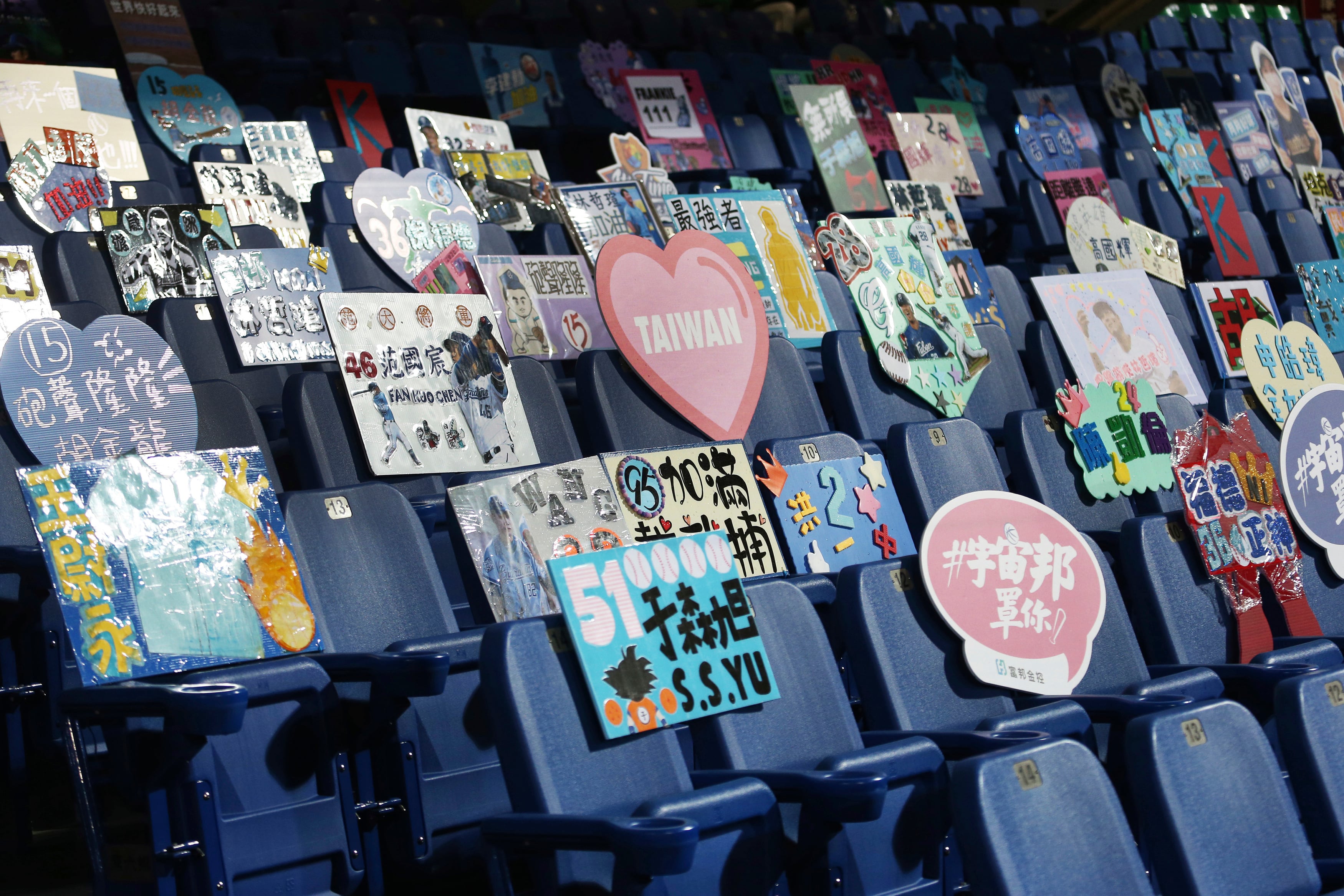 En el parque de Taiwán, se colocaron unos 150 carteles en las butacas. Tienen escritos mensajes que desean suerte a algunos peloteros de los Guardians, el equipo local.